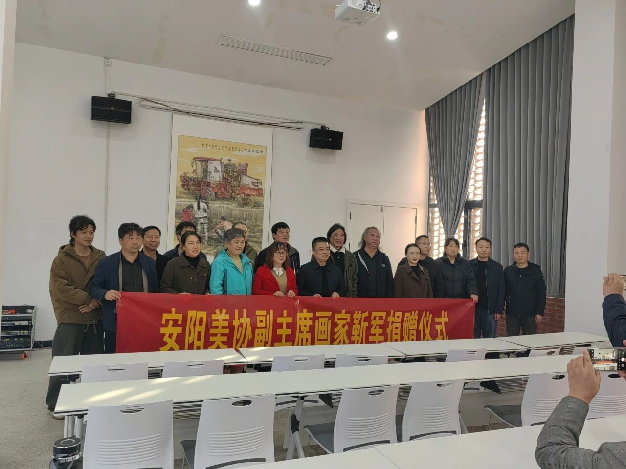 11月9日,安阳市美术家协会副主席、县政协委员靳军先生画作《金色的交响》捐赠仪式在堤上村举行。安阳市美术家协会主席王烨、秘书长王永刚,滑县文学艺术界联合会主席付美芳,滑县美术家协会主席张陆胜、秘书长王辉,枣村乡党委副书记、乡长王日轩,以及部分县美协理事会成员、堤上村“两委”干部共同参加了捐赠仪式。
