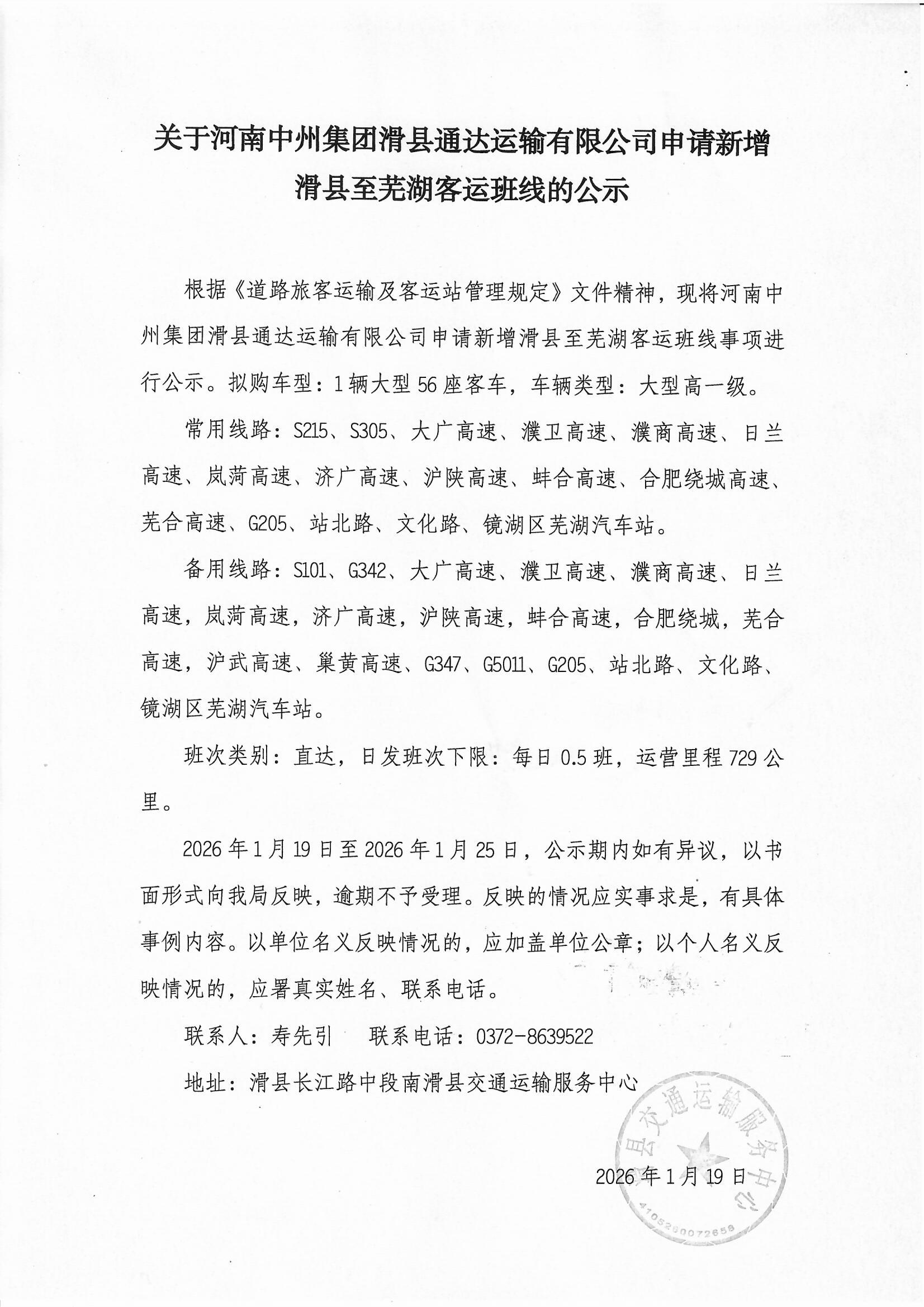 关于河南中州集团滑县通达运输有限公司申请新增滑县至芜湖客运班线的公示